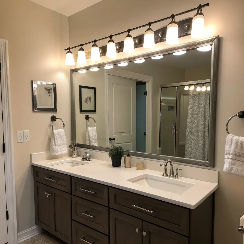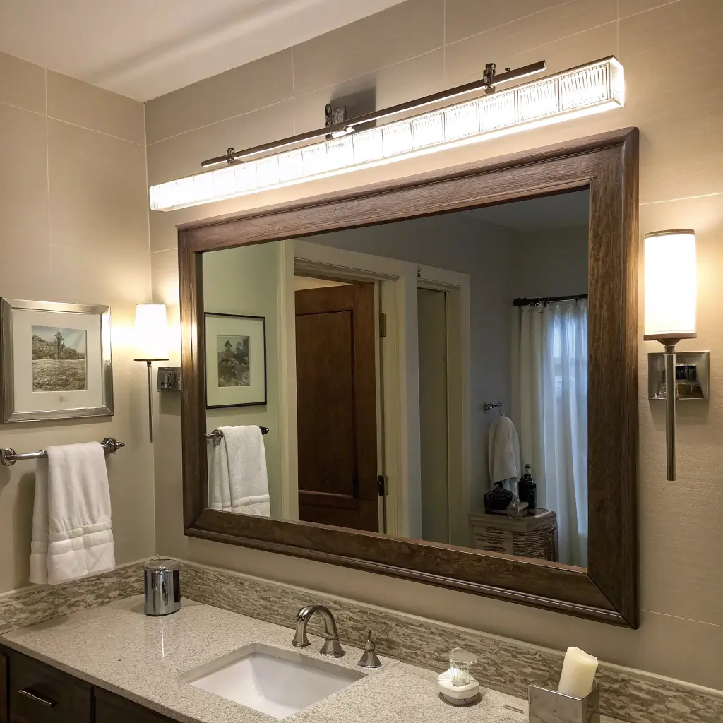 Remember when everyone thought bathroom sconces had to go on the sides of the mirror? Yeah, we’re breaking all those rules now. Centered dual sconce bars give you that symmetrical look that makes my inner perfectionist do a happy dance.