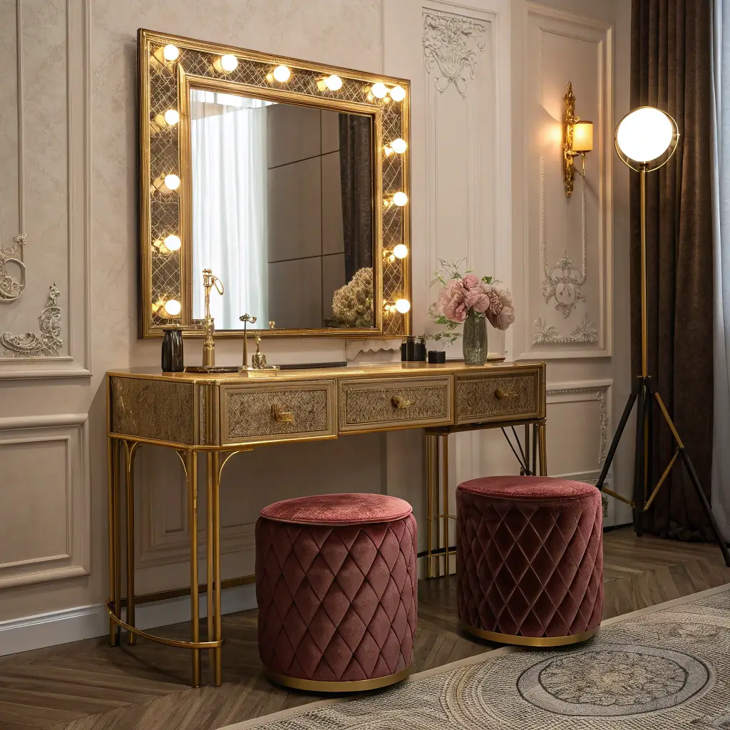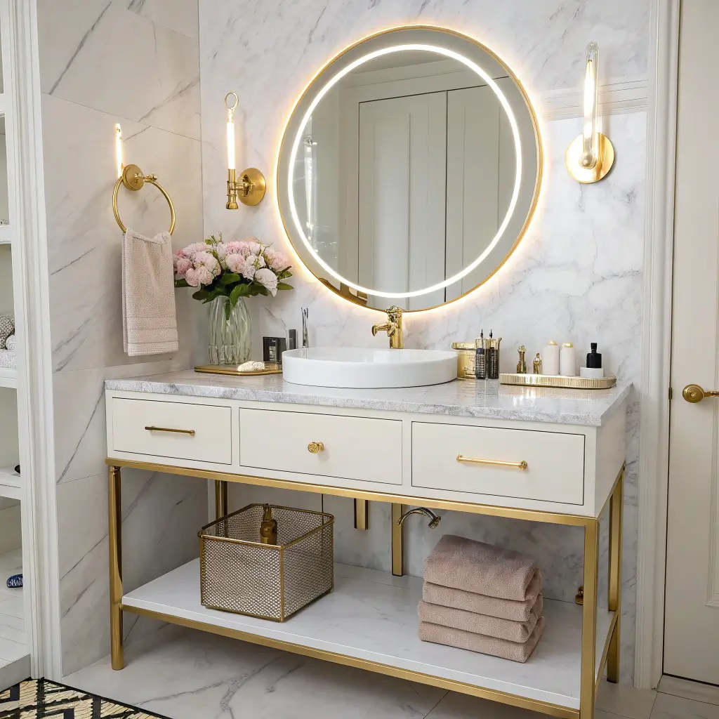 The key to nailing this style lies in the details. Think plush velvet stools, crystal drawer pulls, and metallic accents. Sure, it might be a bit extra, but who doesn’t want to feel like a movie star while getting ready?