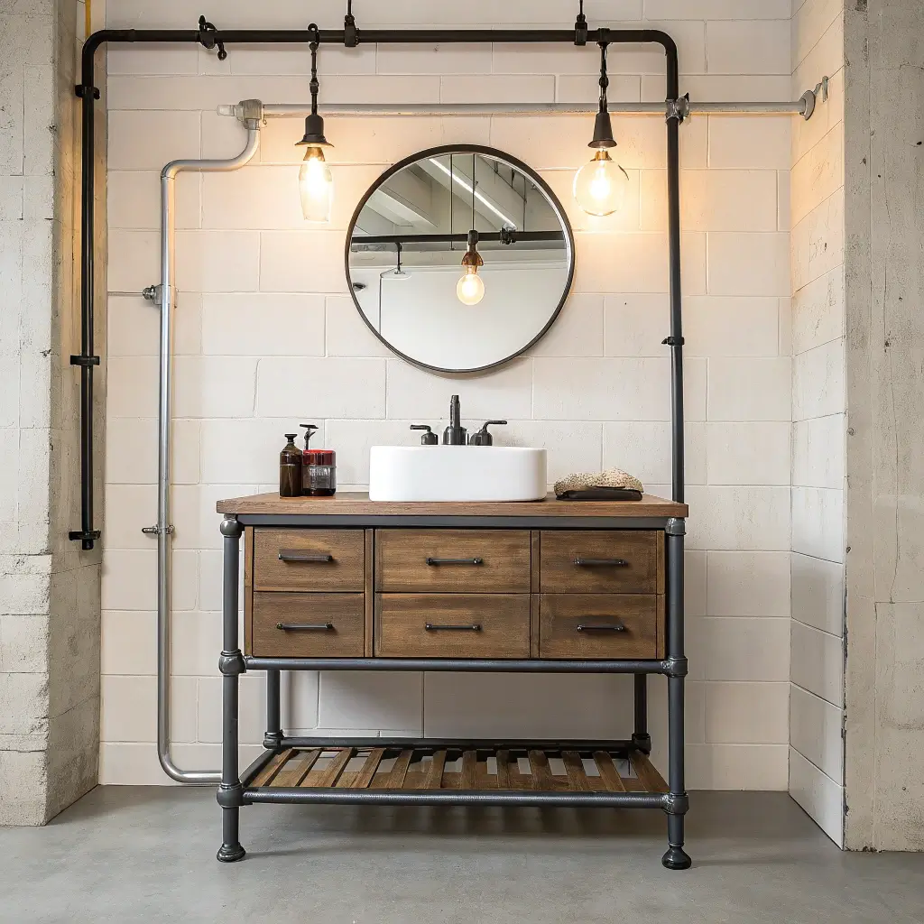 I helped my brother design his bachelor pad bathroom with an industrial vanity made from reclaimed scaffolding planks and iron pipe legs. Cost him less than a fancy store-bought version, and it looks way cooler IMO. The open shelving below means he actually keeps it organized (miracle!).