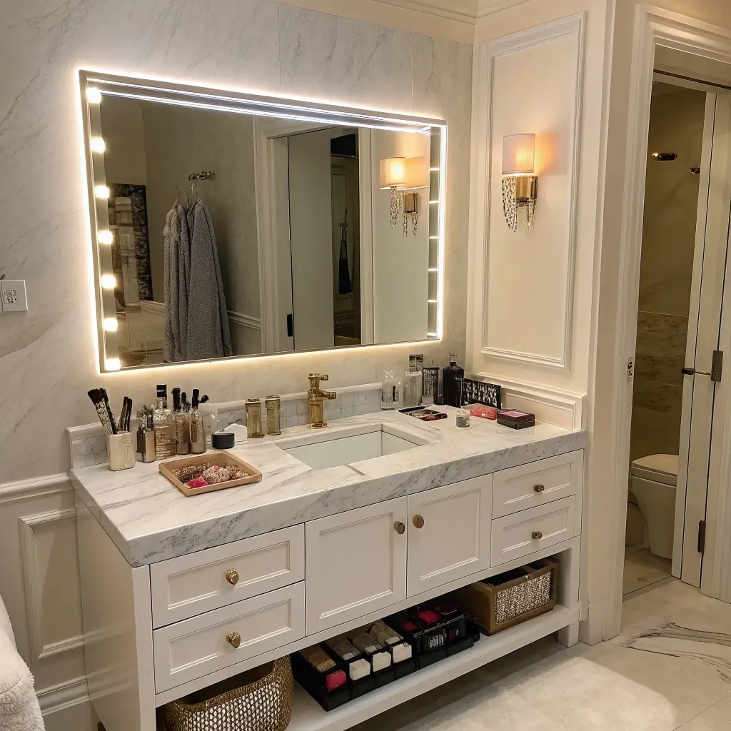 Creating this look doesn’t mean you need to renovate your entire bathroom. I transformed my boring builder-grade vanity into a glamorous setup with some LED bulb string lights from Amazon and a large frameless mirror. Total cost? Under $150. The confidence boost when you’re getting ready? Priceless.