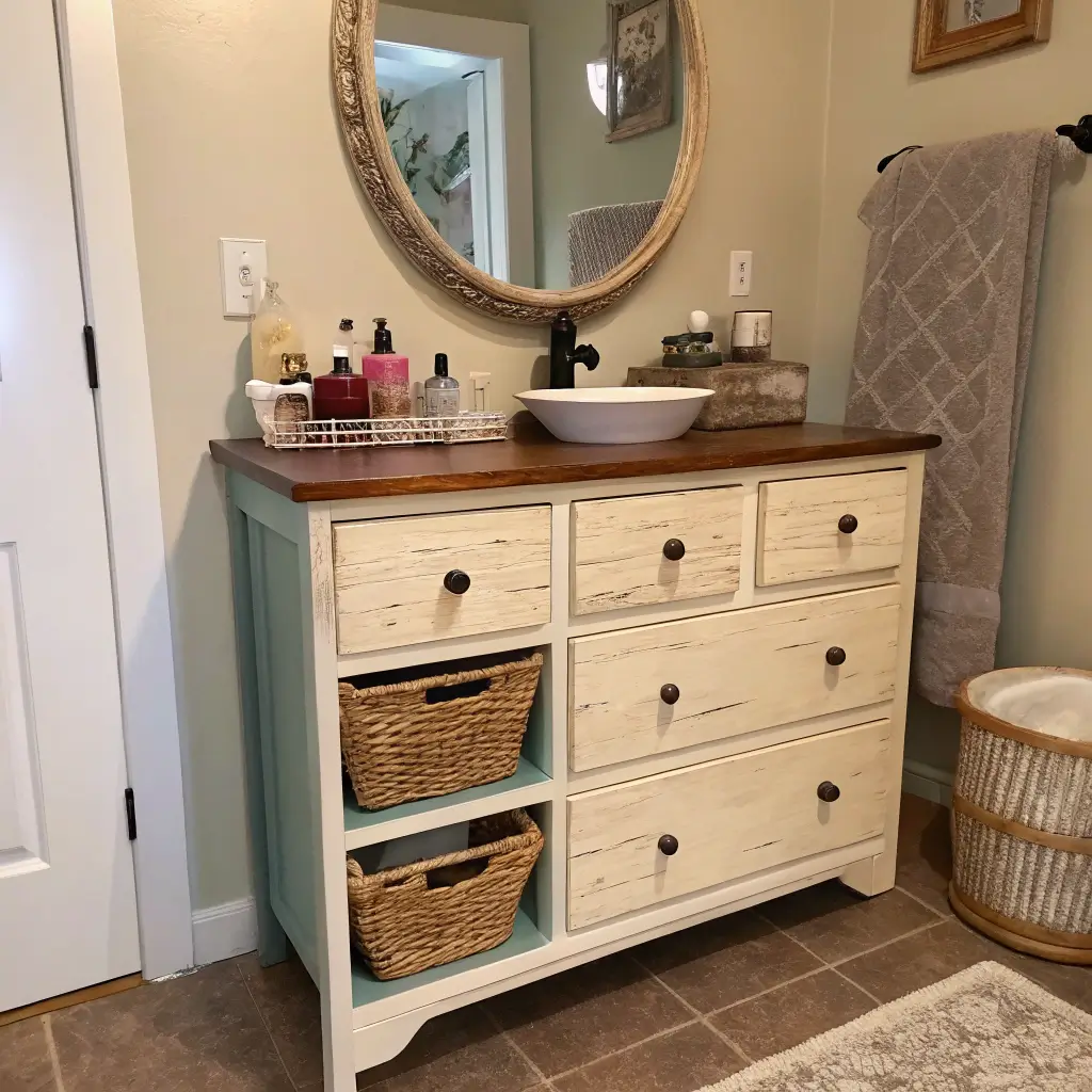 I converted my grandmother’s old dresser into a vanity by cutting holes for plumbing and adding a vessel sink on top. Total cost? About $200 plus a weekend of work. The result? A one-of-a-kind piece with actual character and storage for days.