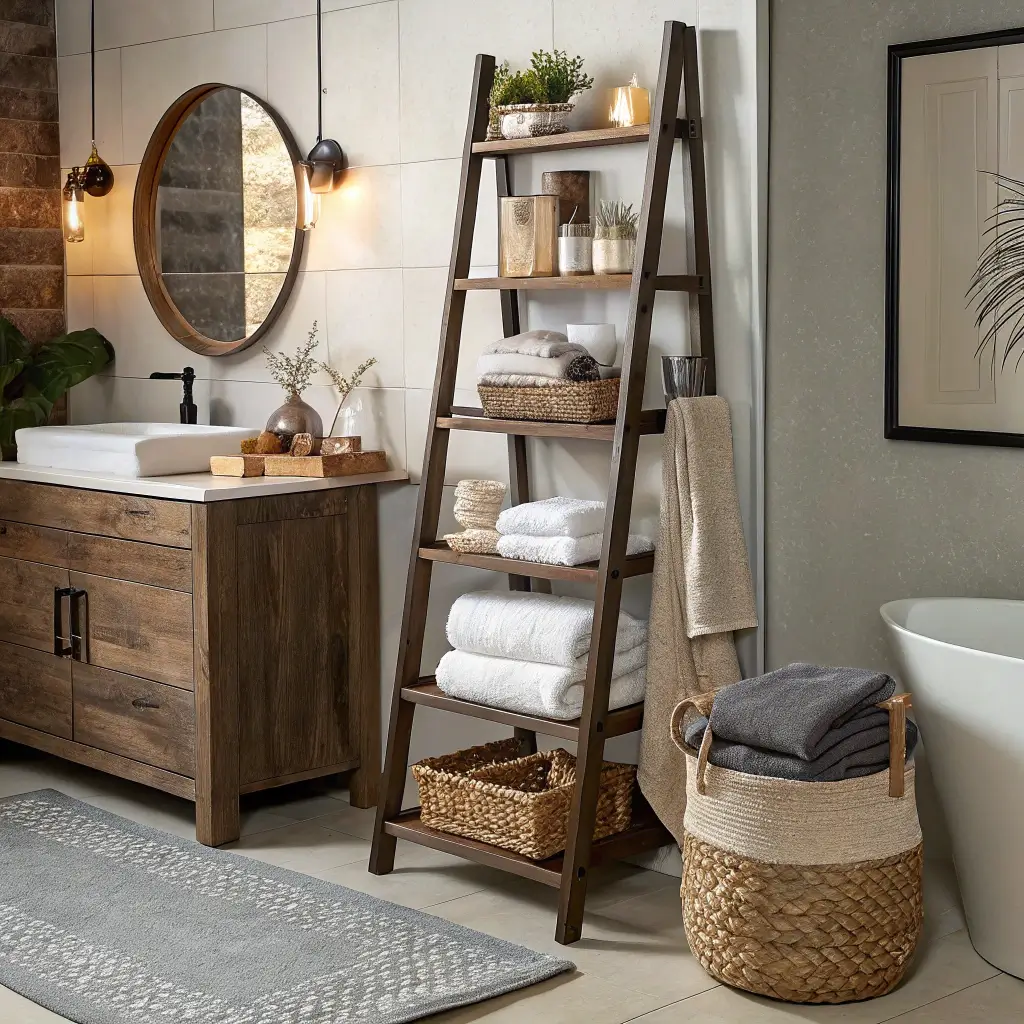 Ladder shelves bring that perfect blend of form and function that makes my designer heart sing. They lean against the wall casually, like they just stopped by for a chat but decided to stay and hold your towels. The graduated shelf sizes naturally organize items from large to small as you go up.