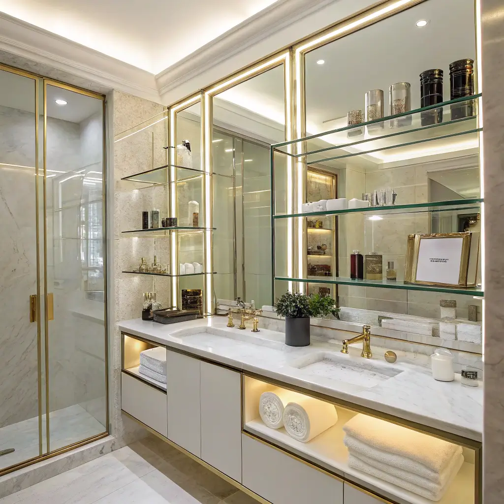 Mirrored shelves pull double duty – storage and making your bathroom look twice its size. The reflective backing creates depth while the shelf itself holds your essentials. It’s genius, really.