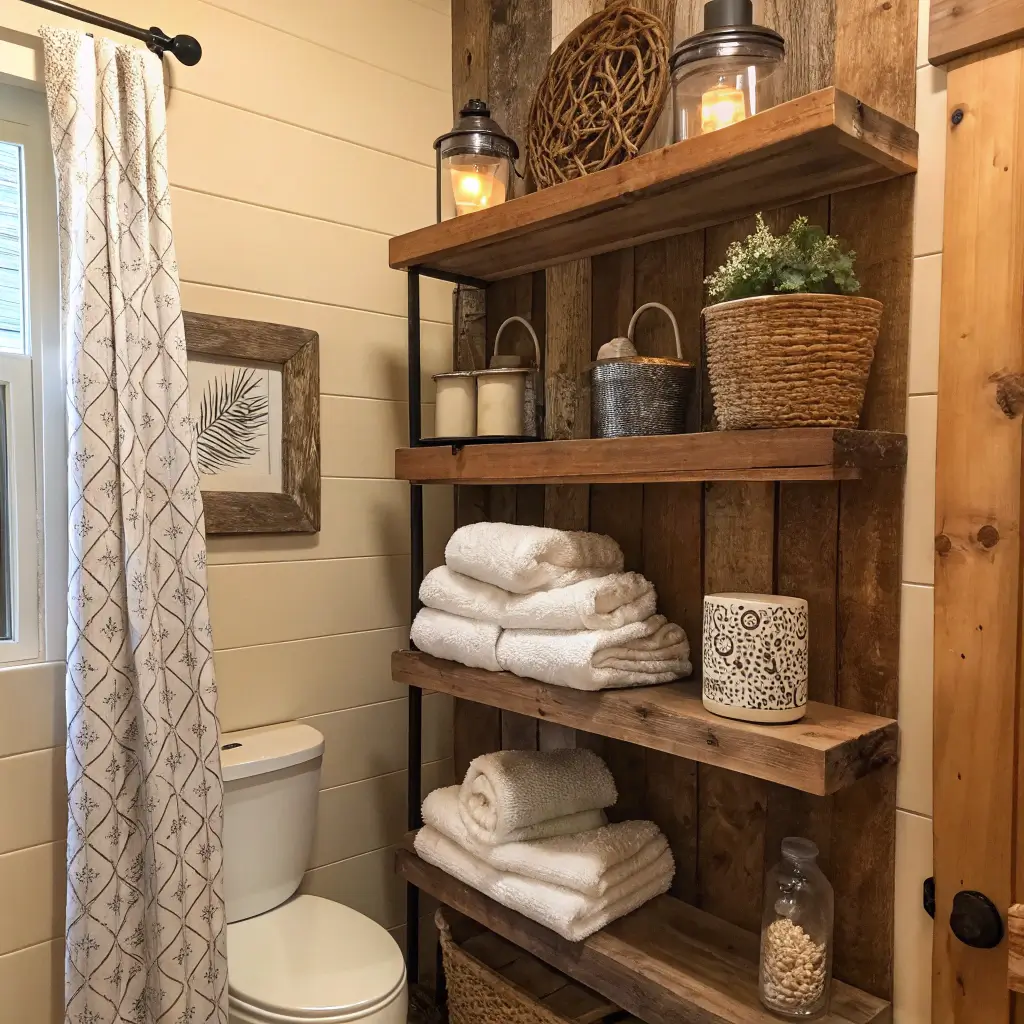 Barnwood shelves bring warmth and character that new wood just can’t match. Each piece tells a story through its weathered grain, nail holes, and imperfections. They transform sterile bathrooms into cozy retreats.