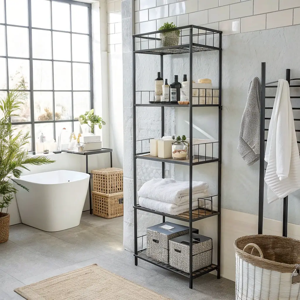 Metal grid shelves bring that modern, almost laboratory-like precision to bathroom organization. The open grid design provides ventilation while the metal construction handles moisture like a champ.