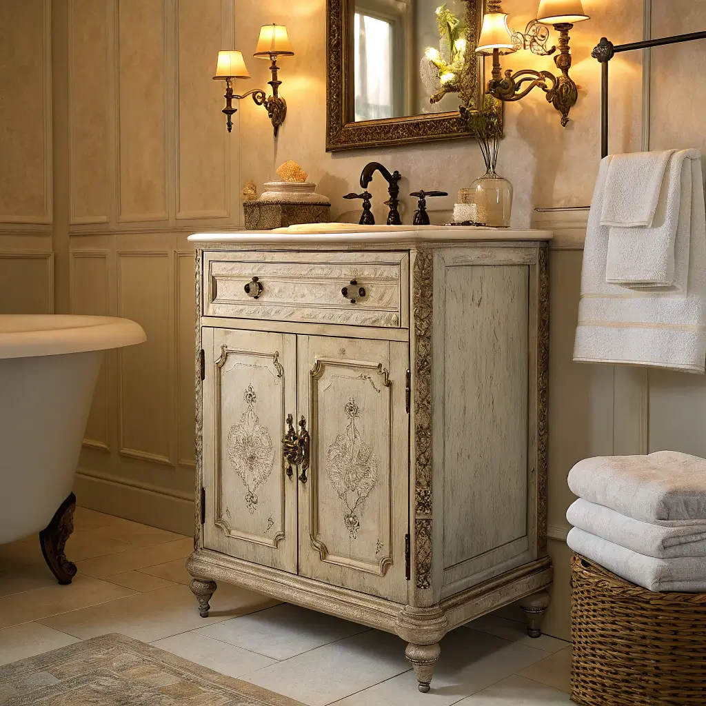 There’s something about vintage-style cabinets that makes a bathroom feel intentional, not just functional. Maybe it’s because they remind us of grandma’s house, where everything had its place and bathrooms were actual rooms, not afterthoughts.