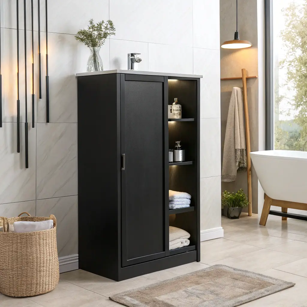 I use the open shelves for rolled towels (Pinterest-worthy, if I do say so myself), fancy soaps, and that one succulent that somehow survives bathroom humidity. The closed sections? That’s where the real life happens – half-empty shampoo bottles, cleaning supplies, and that economy-size package of toilet paper.