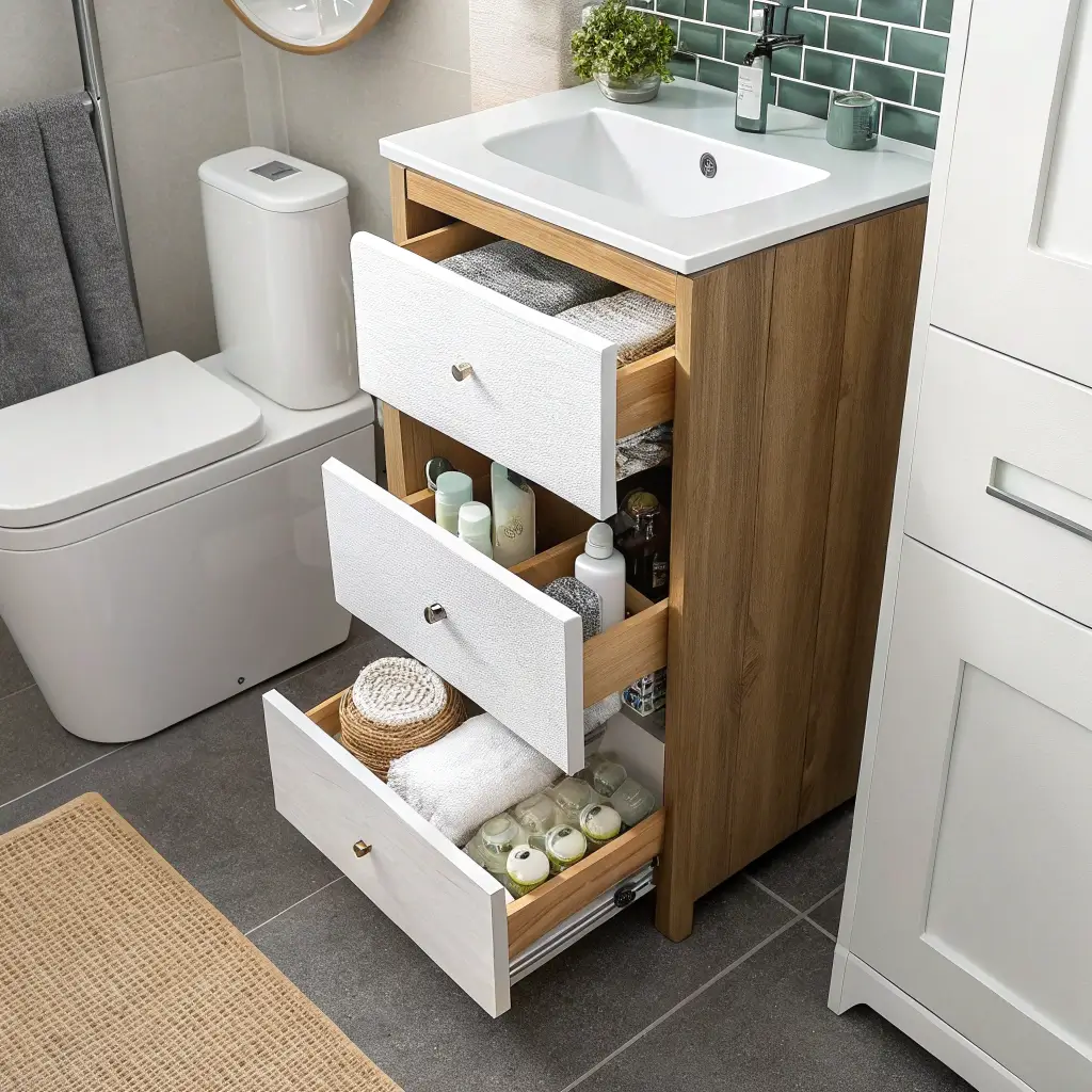 I retrofitted my existing vanity with pull-out drawers, and it literally doubled my usable storage space. Every single inch is now accessible. The deep drawers hold hair tools, the shallow ones organize makeup, and everything has its place.
