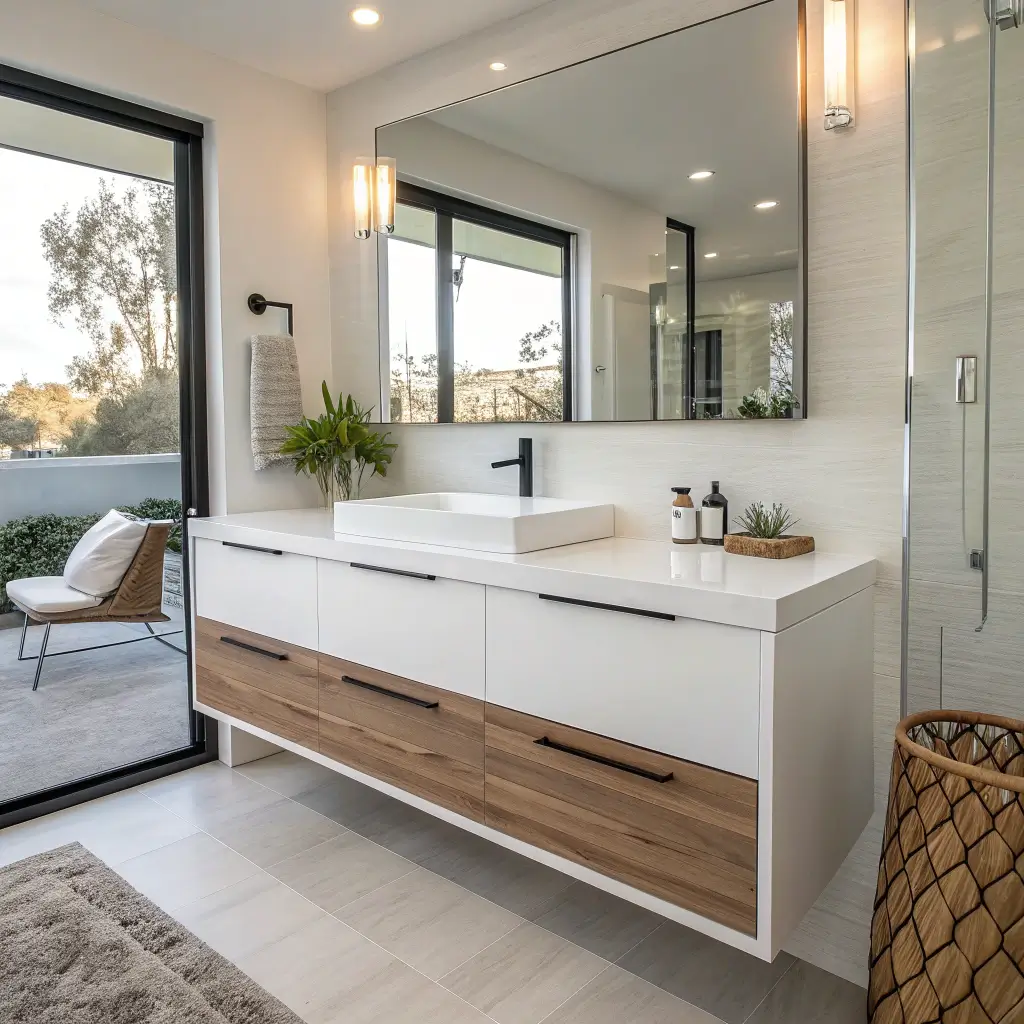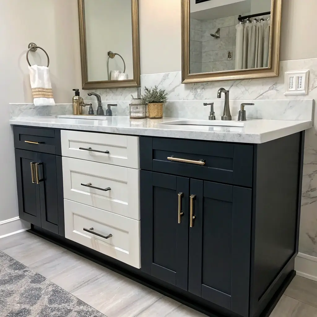 Why choose one color when two work better together? Two-tone vanities add visual interest without overwhelming the space. Dark lower cabinets with light uppers create the illusion of height, while the reverse keeps things grounded.
