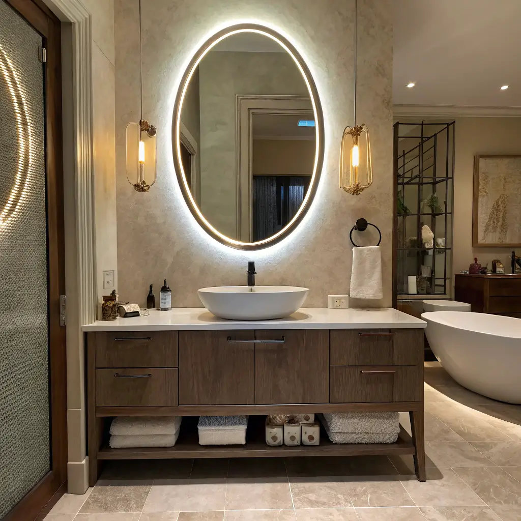 Oval backlit mirrors combine the best of both worlds – soft, flattering shapes with Hollywood-worthy lighting. These mirrors create this gorgeous halo effect that makes your bathroom feel like a high-end spa.