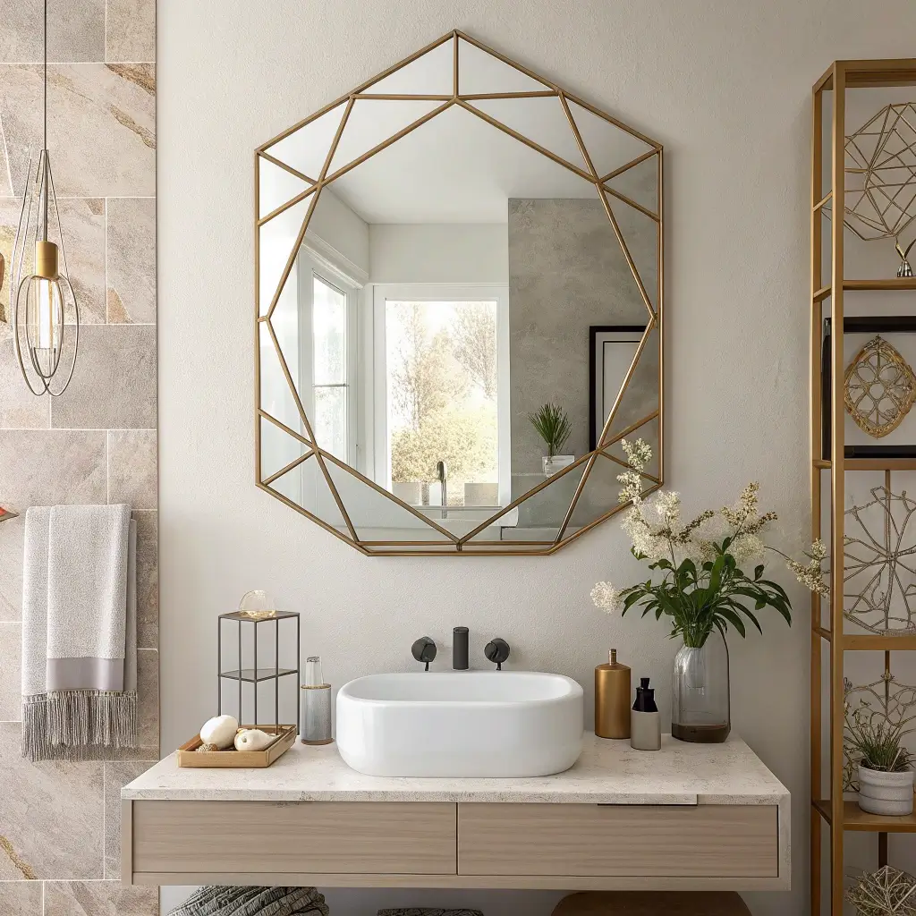 Hexagons, octagons, and diamonds – oh my! Geometric mirrors are having a serious moment, and honestly? They deserve it. These angular beauties add instant architectural interest to even the most boring bathroom.