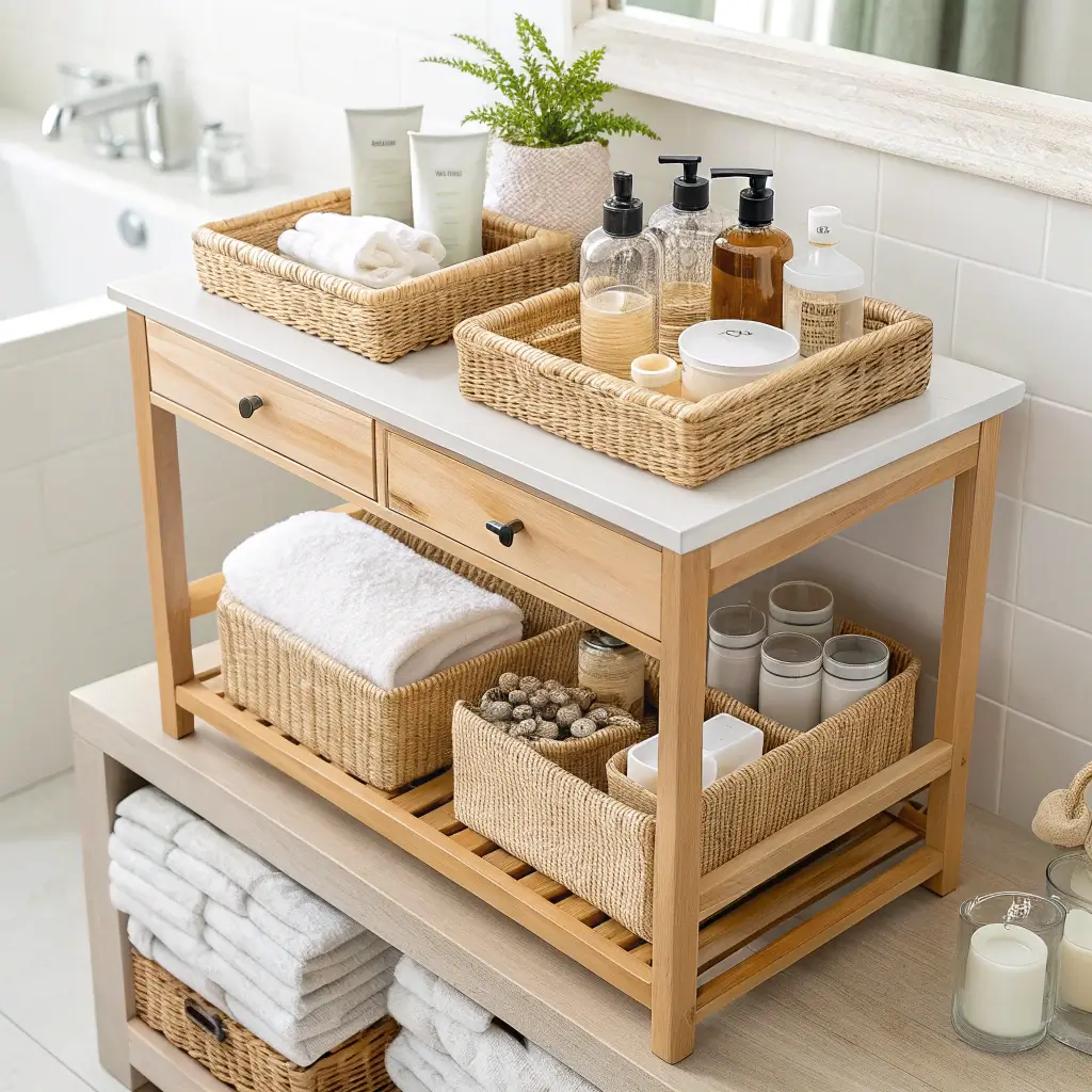 Bamboo organizers bring natural warmth while being incredibly durable. They’re naturally antimicrobial too, which is perfect for bathroom humidity. I use bamboo drawer dividers, toothbrush holders, and even a countertop organizer for daily essentials.