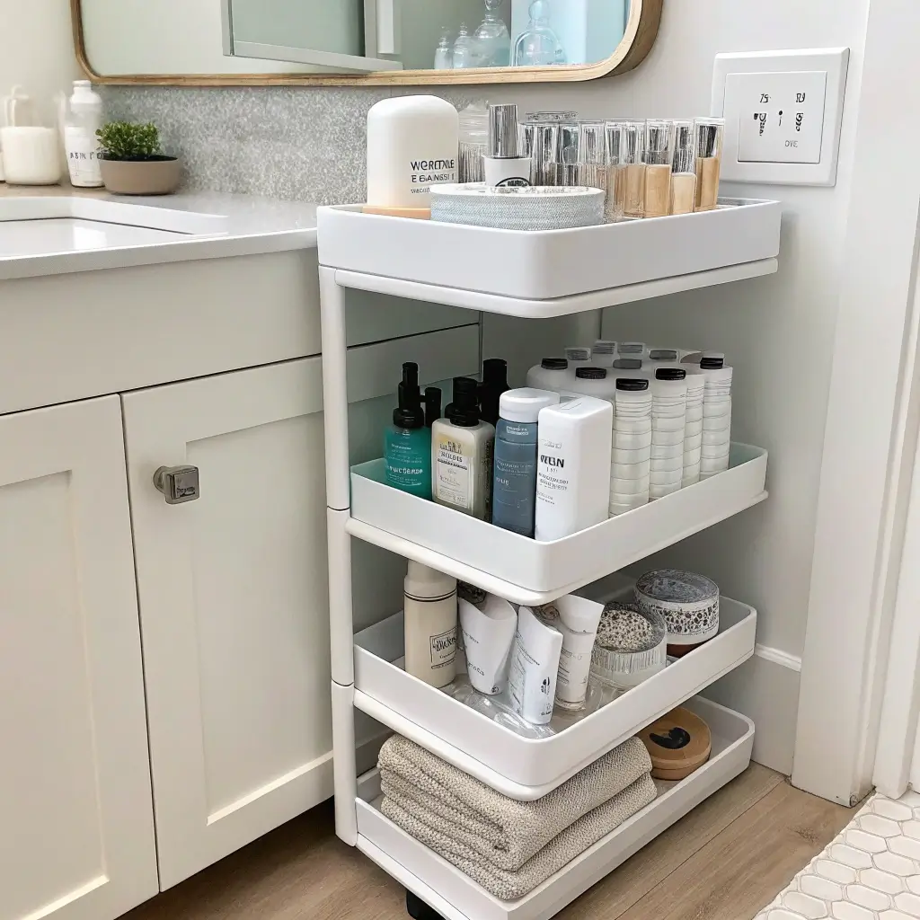 I transformed my friend’s microscopic vanity using vertical space exclusively. Adhesive shelves on the wall, hanging organizers on the towel bar, and a rolling cart that slides beside the sink. She went from zero storage to organized queen.