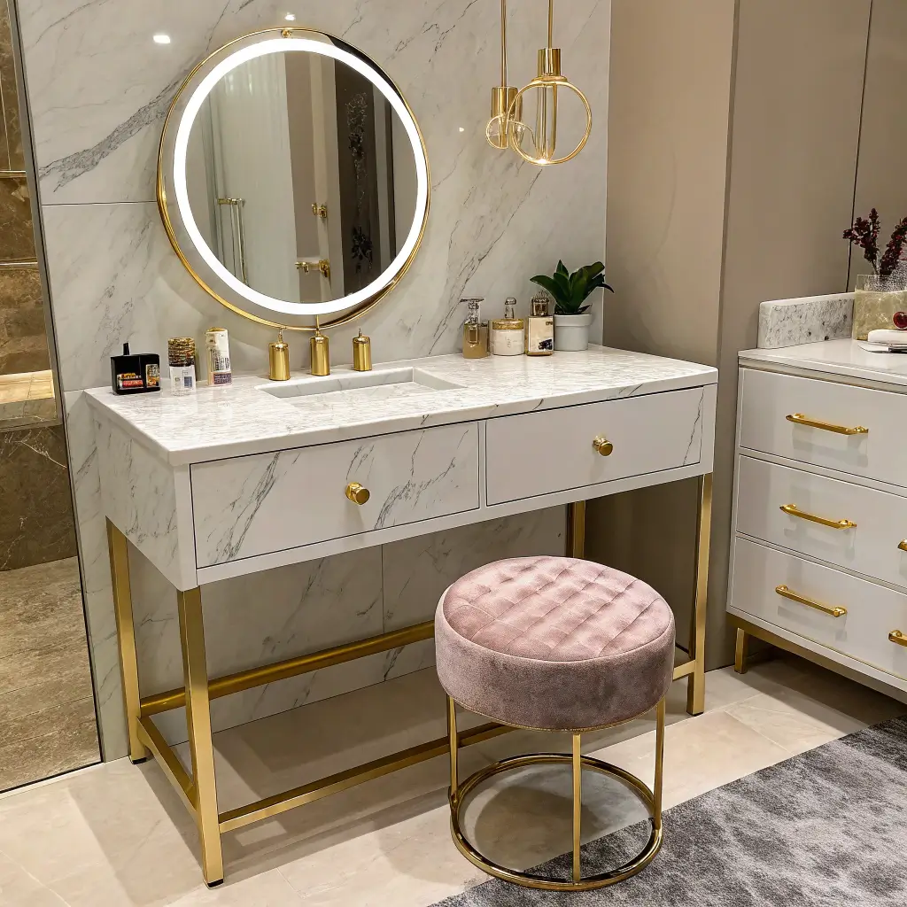 Real marble brings natural veining that makes each piece unique – no two setups look identical. The makeup zone often features: