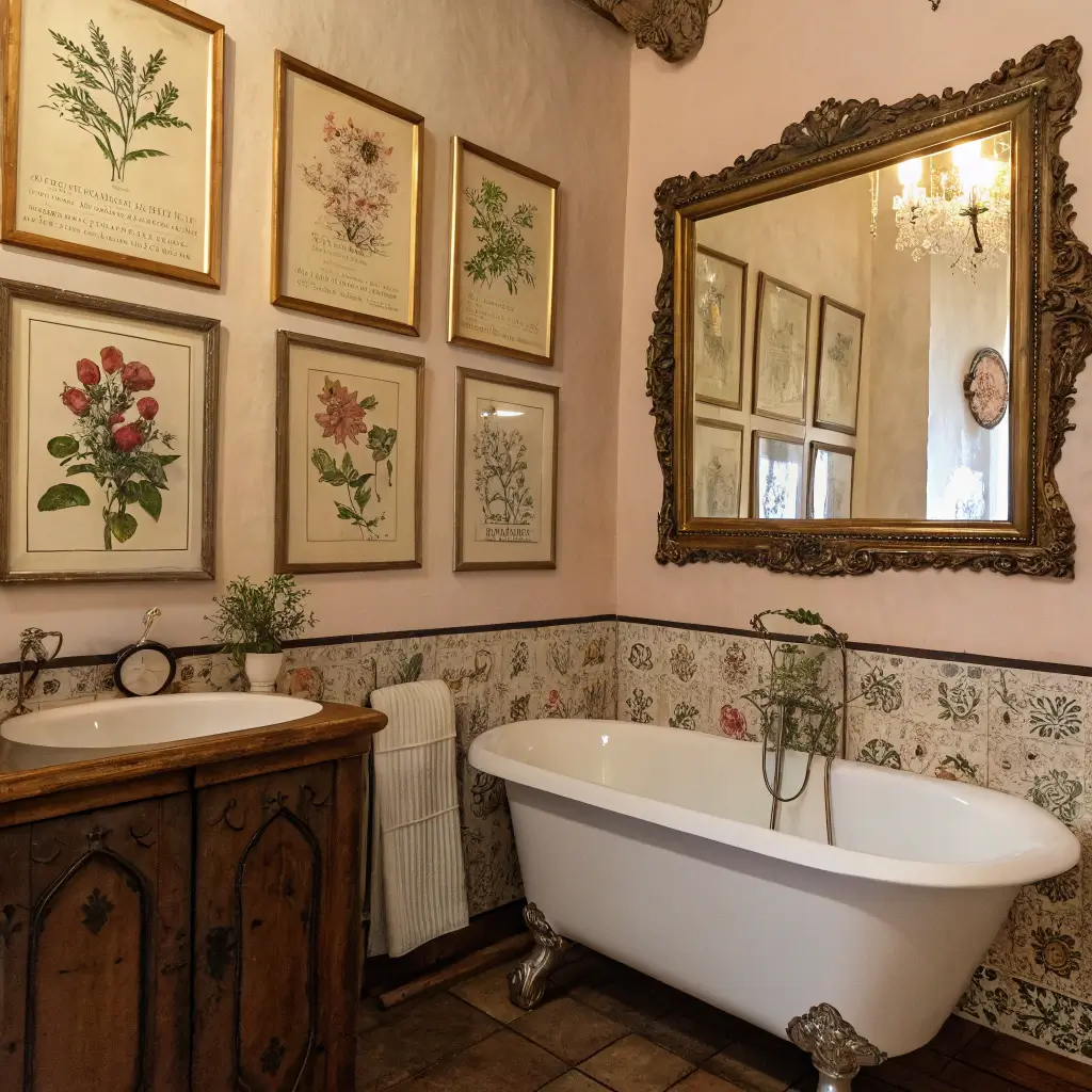 Vintage doesn’t mean dusty and dated. You can mix old advertisement posters, botanical prints from antiquarian books, or even vintage patent drawings for bathroom fixtures (how meta is that?). The contrast between old art and modern fixtures creates this amazing tension that designers pay big bucks to achieve.