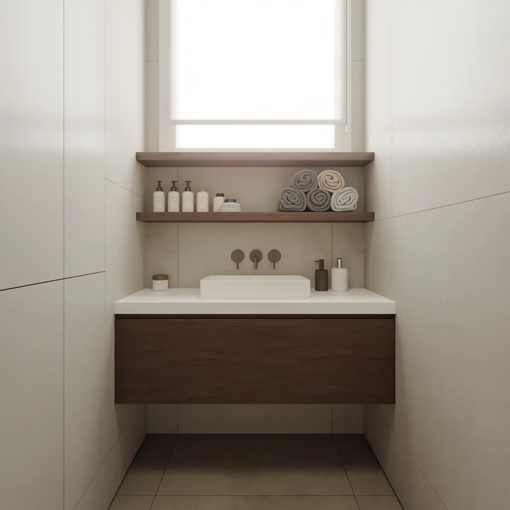 The minimalist approach works especially well in small bathrooms where busy patterns or chunky furniture would feel claustrophobic. I installed two long oak shelves in my half-bath, and they make the whole room feel more expensive and put-together.