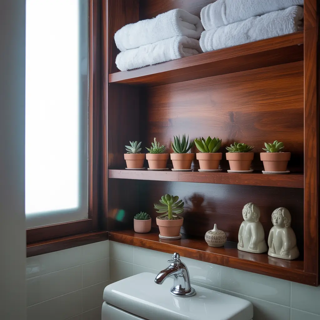 Sometimes less really is more. Simple wooden shelves bring warmth to your bathroom without overwhelming the space. They’re perfect for displaying pretty bottles, folded towels, or that succulent you swear you won’t kill this time.