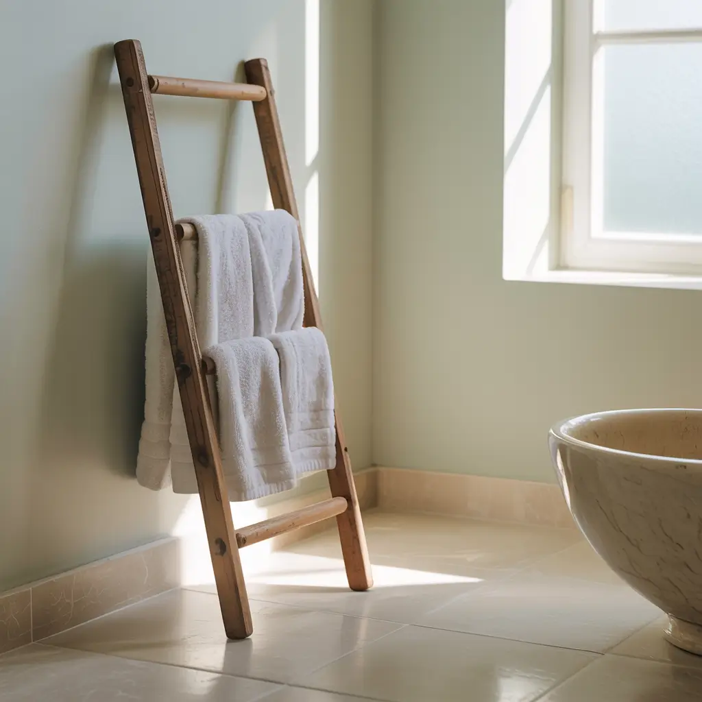 The best part about ladder towel racks is their versatility. Lean them against the wall, mount them permanently, or get a freestanding version you can move around. I’ve got a bamboo one that adds this zen spa feeling to my master bath – total game-changer for the vibe.