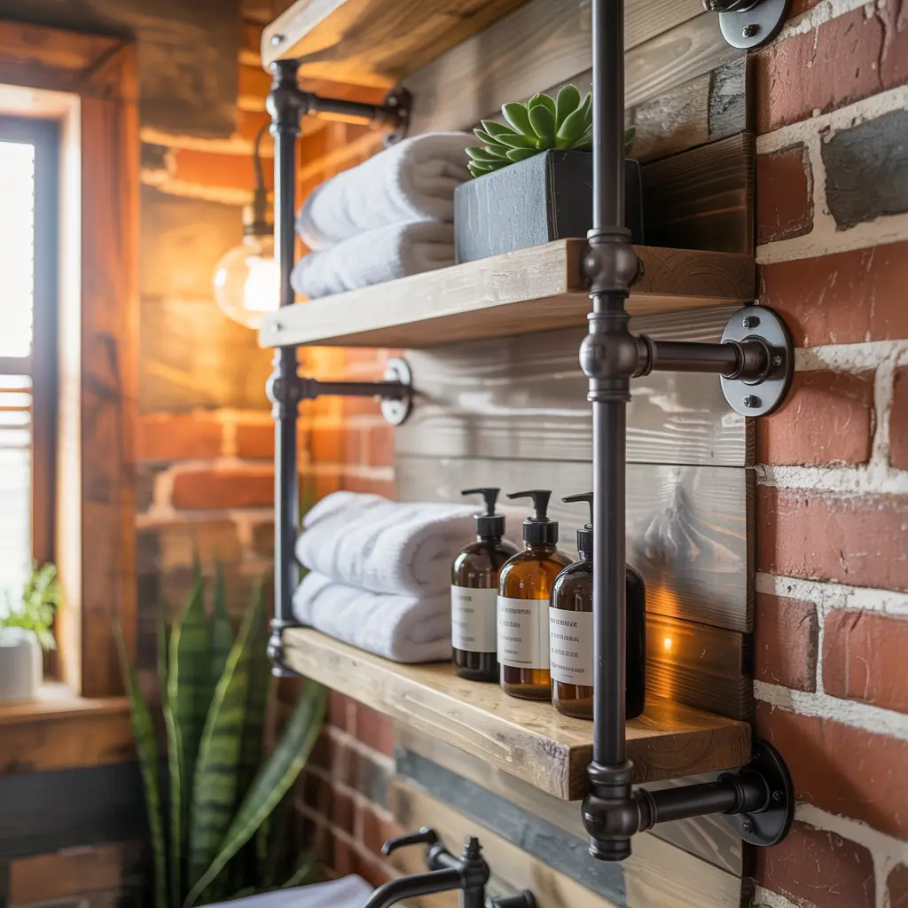 Industrial style isn’t going anywhere, and pipe shelving brings that edgy, urban vibe to your bathroom. Black iron pipes with wooden shelves create this perfect contrast that works with both modern and traditional decor.