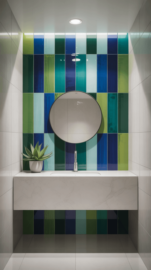 - Accent strips: Use a thin line of glass mosaic tiles as a decorative band or border within a field of larger tiles.