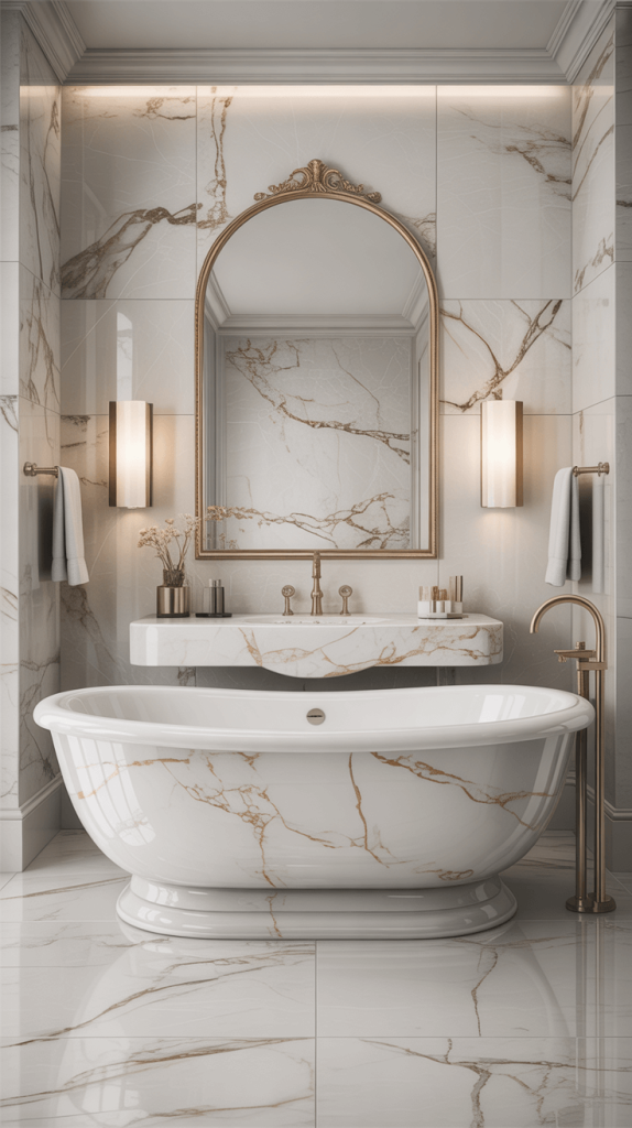 Why it works: The cool, veined elegance of marble provides the perfect neutral backdrop for the warm glow of gold fixtures and accents.