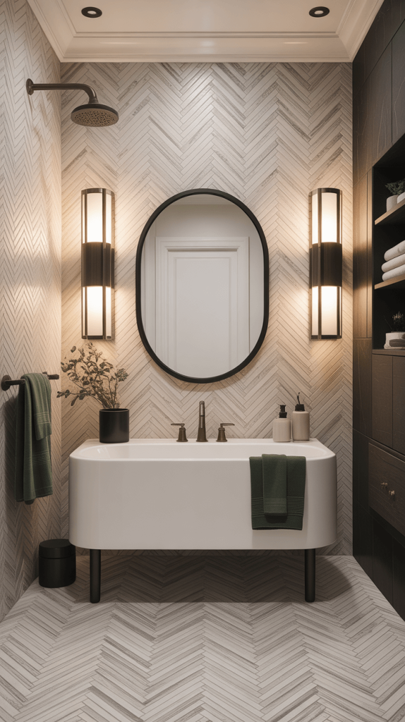 You’ve seen herringbone on floors and in fancy parquet woodwork, but have you considered it for your bathroom walls? This classic V-shaped pattern adds dynamic energy and a touch of tailored sophistication.