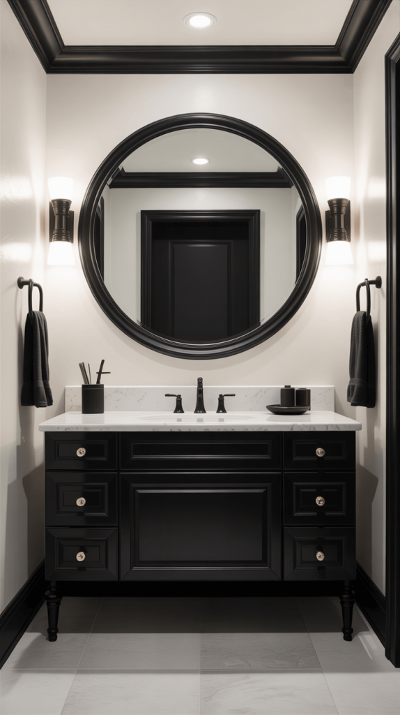 - Create a trio: The most powerful setup is a black-framed mirror, flanked by two black sconces, with a black faucet below. It’s a trifecta of style.