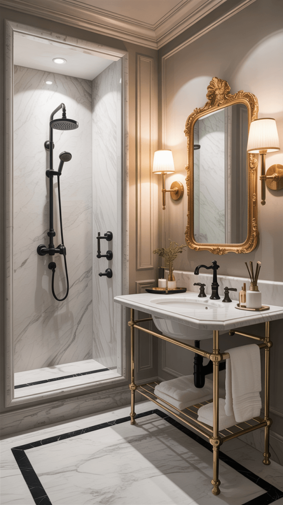 - My go-to move: A matte black shower system with gold shower handles and a gorgeous gold-rimmed round mirror. It’s a look that says, “I have my life together,” even if my laundry pile says otherwise 🙂
