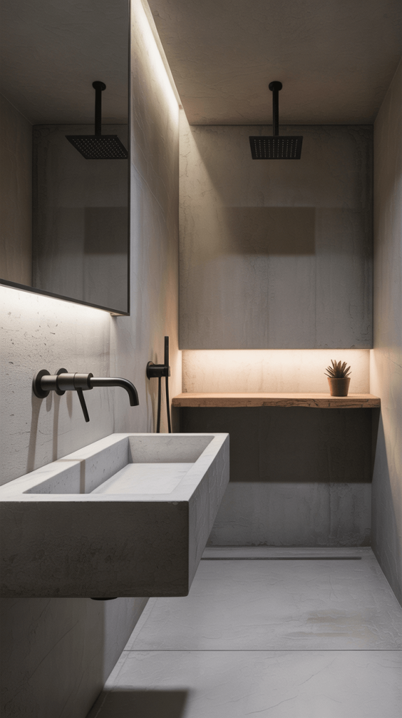 - You can fake the concrete: Don’t worry, you don’t need to pour a concrete slab. Concrete-look tiles, concrete-effect vanity tops, or even concrete-style wall paint can achieve this look.