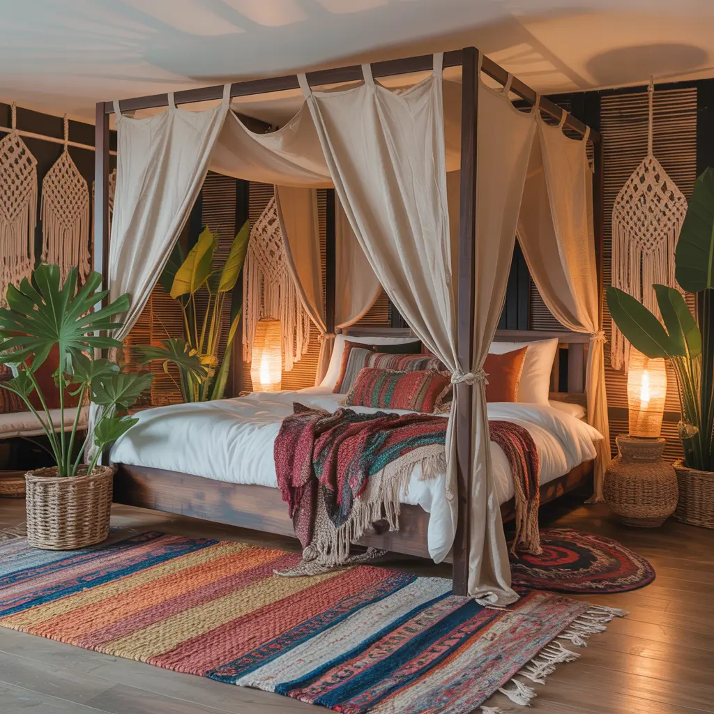 Texture is everything in boho design. Combine chunky knit blankets, woven baskets, jute rugs, and velvet cushions. Add string lights or a Moroccan-style lantern for that dreamy evening glow.