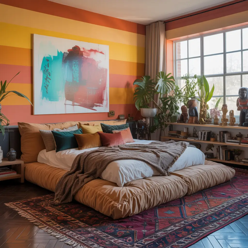Platform beds work brilliantly for this look – they’re low-profile and create clean lines. Add some floating shelves instead of bulky nightstands. Keep decorations to a minimum, but make them count: maybe one piece of abstract art or a single plant in a ceramic pot.