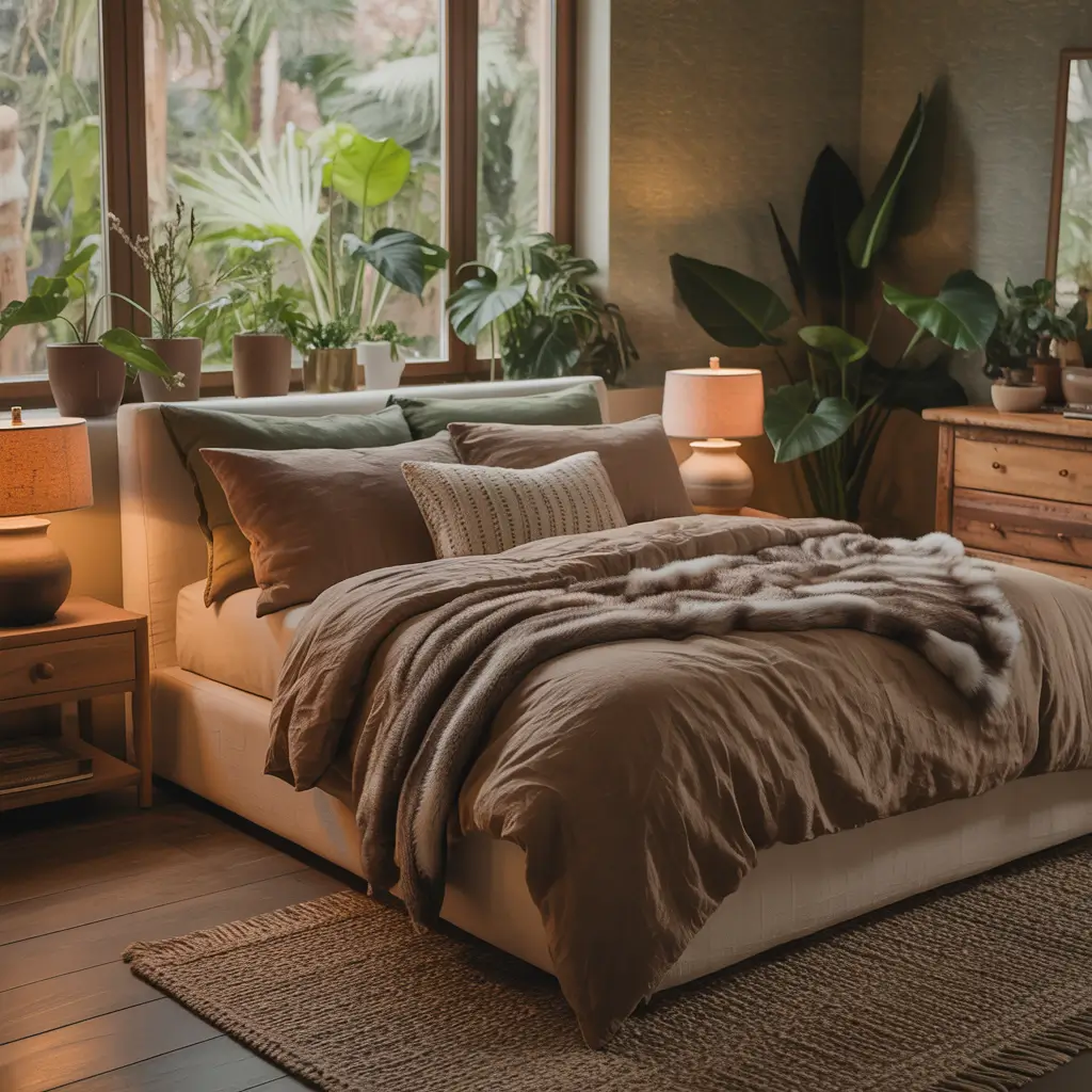 Earthy bedrooms bring the outside in without the bugs and unpredictable weather. These spaces use nature’s color palette—browns, greens, terracottas—to create grounding energy that makes you feel centered. My brother, a total city guy, went earthy with his bedroom and swears he sleeps better now.