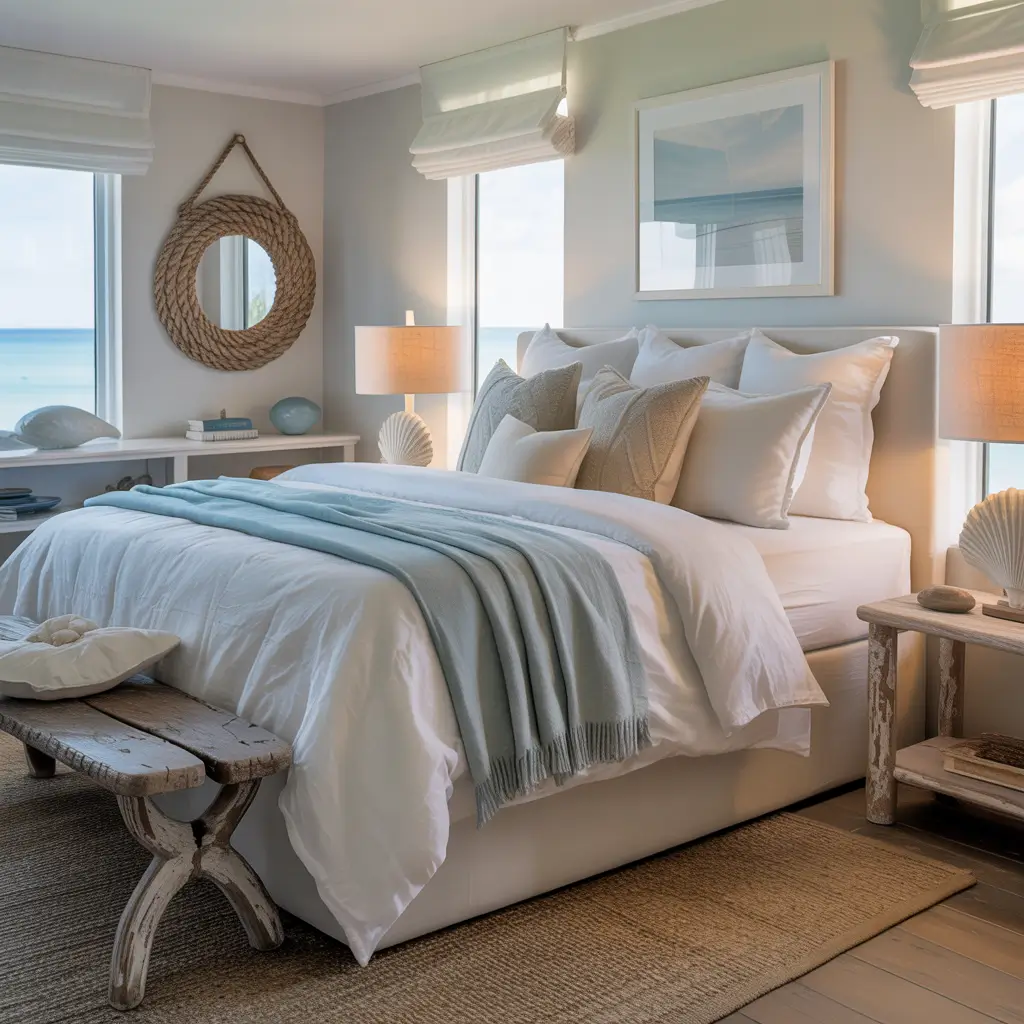 Modern coastal design embraces natural textures and materials. Think weathered wood, jute rugs, linen bedding, and subtle ocean-inspired colors. Skip the obvious seashells and opt for abstract ocean art or coral-inspired sculptures instead.