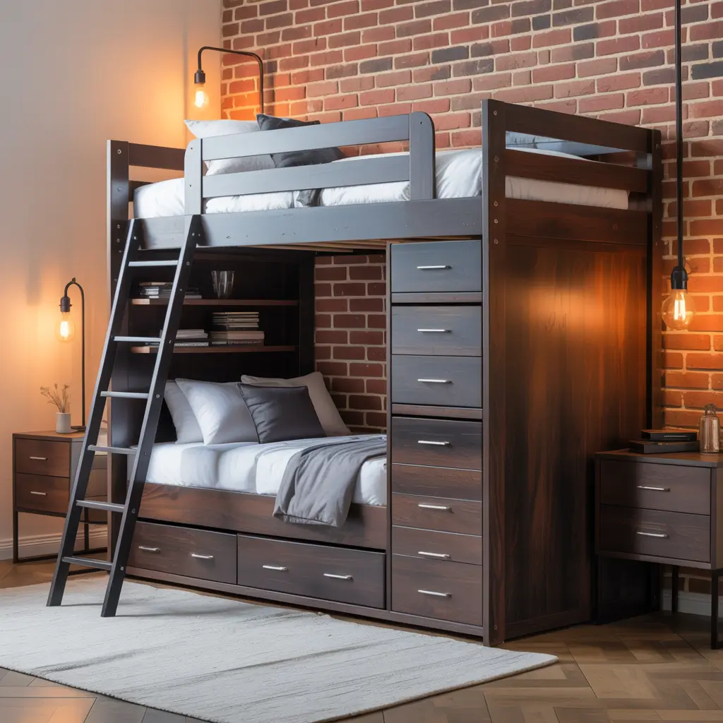 The loft aesthetic works because it breaks conventional bedroom rules. Why should your bed sit on the floor when it could float above your workspace? This style basically doubles your square footage without moving any walls.