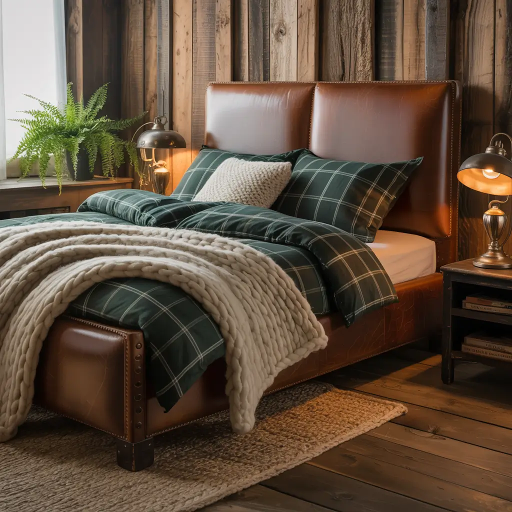 Sometimes you want your bedroom to feel like that cabin in the woods you’ve always dreamed about. Raw wood, plaid patterns, and wilderness vibes transform any space into a masculine retreat that screams “I could totally survive in the wilderness” (even if your idea of roughing it is weak WiFi).