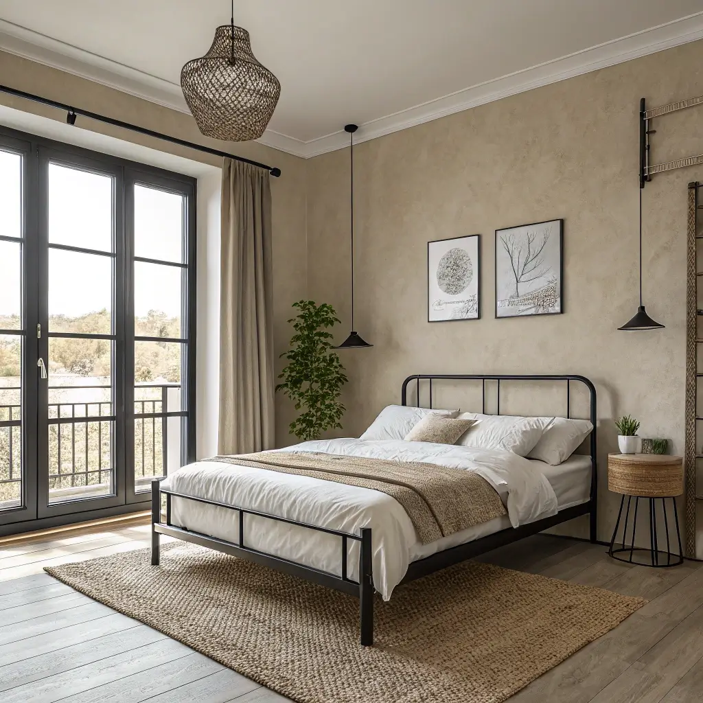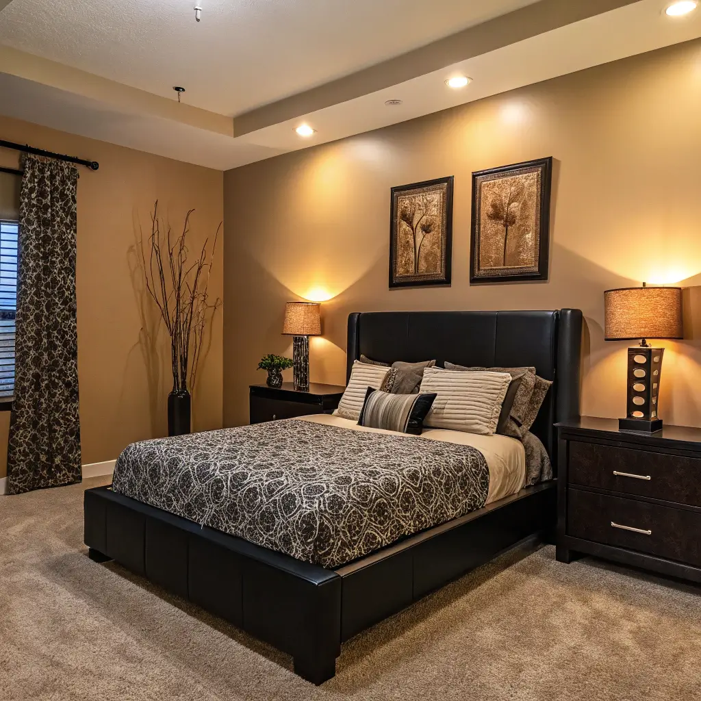 Who says beige and black can’t do rustic? Mix in some weathered wood, wrought iron details, and suddenly you’ve got a bedroom that feels like a chic farmhouse retreat. The key is choosing the right shades – think warm, sandy beiges and soft, charcoal blacks rather than stark contrasts.