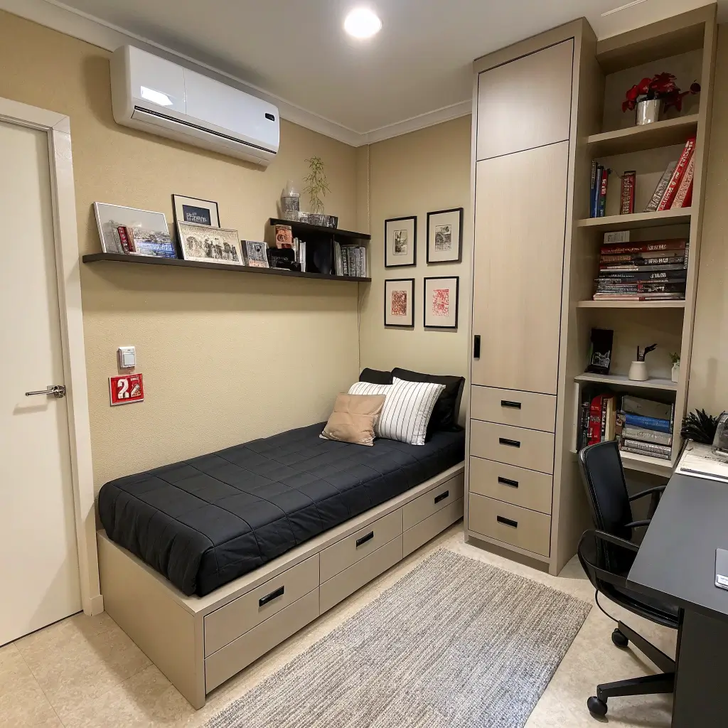Living in a shoebox? Join the club! My first apartment bedroom was so small I could touch both walls while lying in bed. But here’s the thing – beige and black might actually be the best color combo for tiny bedrooms.
