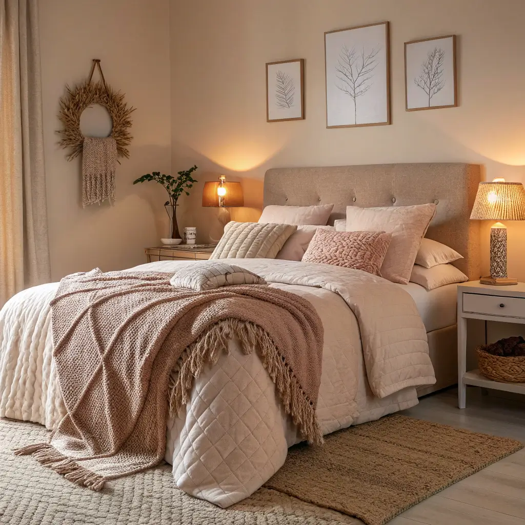 Now, if minimalism makes you yawn, let’s talk about creating a cozy sanctuary. Dusty pink accents against beige backgrounds create this incredibly warm, inviting atmosphere that practically begs you to crawl into bed with a good book.
