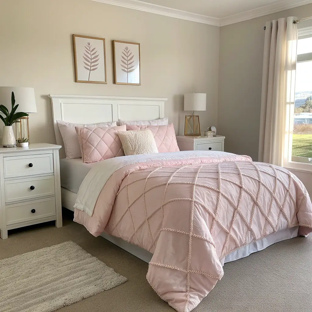 Soft Beige Bedroom with Pink Textured Fabrics