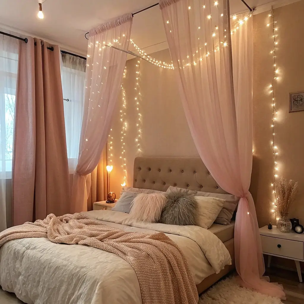 Ever noticed how the coziest bedrooms always have multiple light sources? Skip the harsh overhead lighting and go for warm table lamps and string lights. The beige and dusty pink combo looks absolutely gorgeous in soft, ambient lighting.