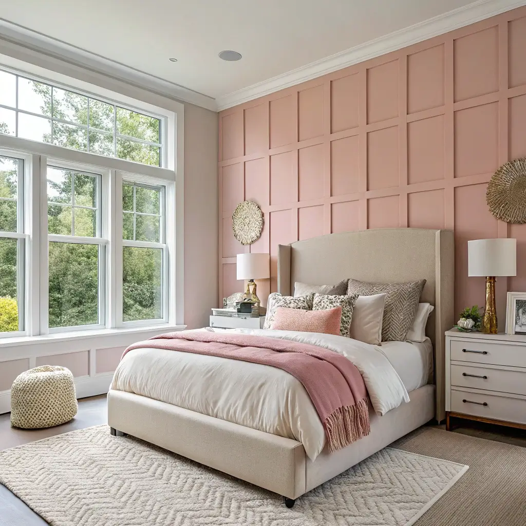 The wall behind your bed usually works best. It creates a natural focal point and frames your sleeping area beautifully. Go for muted pink tones rather than bright ones – think dusty rose, blush, or even a pink-tinted terracotta.