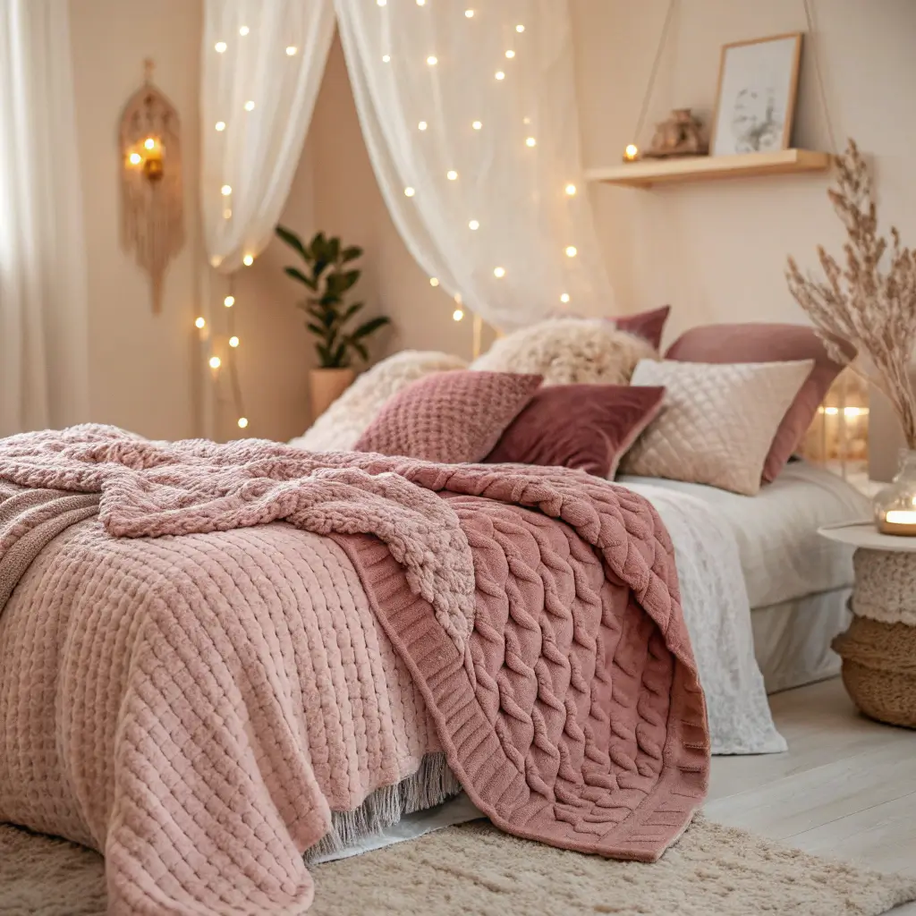 - Top layers: Mix of beige and pink throw blankets