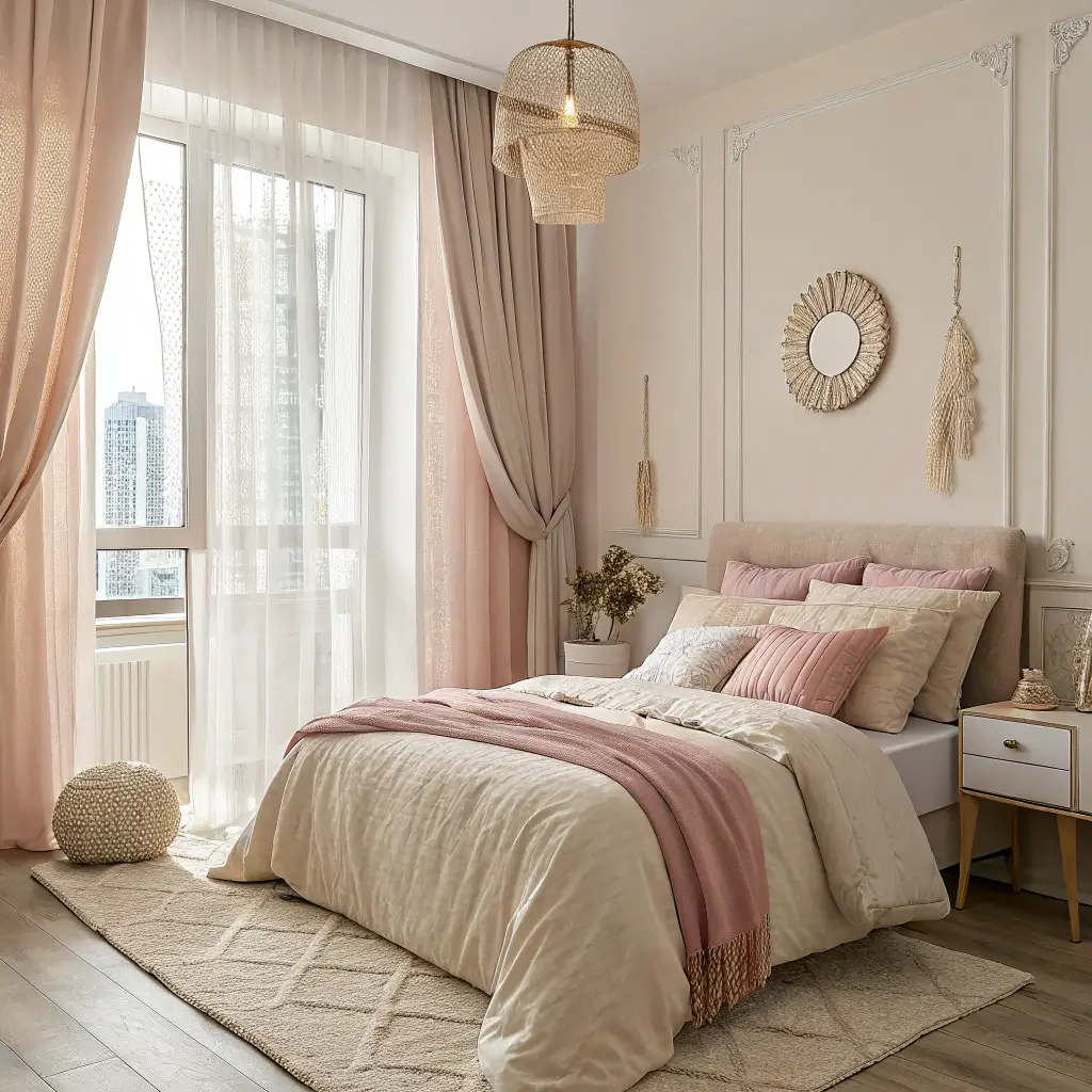 Storage becomes part of the design here. Beige baskets, neutral curtains hiding closet chaos, furniture that doubles as storage – everything blends seamlessly. The room breathes instead of feeling stuffed, even when you’re maximizing every square inch.