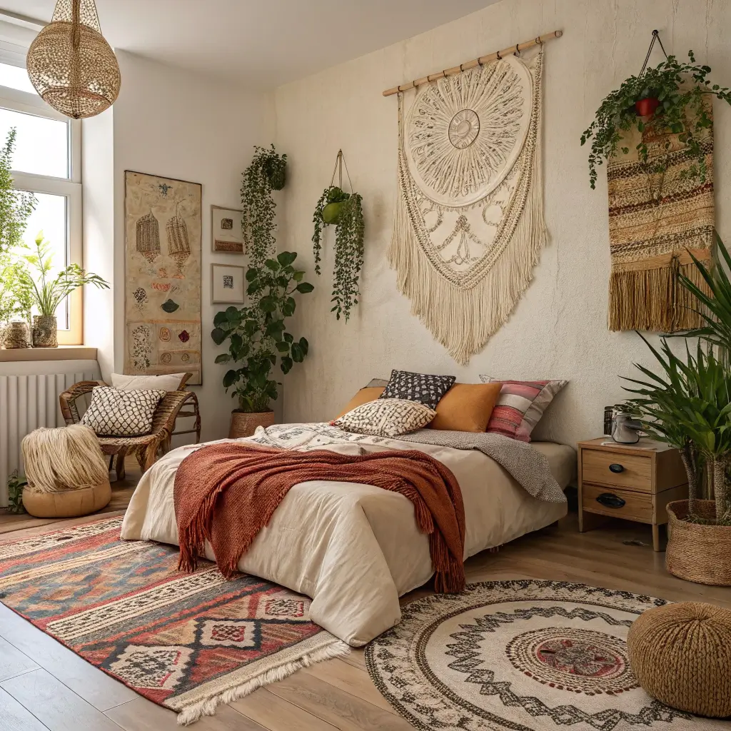 Start with beige walls and layer in natural textures – macrame wall hangings, rattan furniture, jute rugs. The monochromatic palette lets these textures shine without overwhelming the space. I’ve got a beige boho corner in my bedroom with a hanging chair, and it’s become my favorite reading spot. The neutral palette keeps it calm while the boho elements add personality.