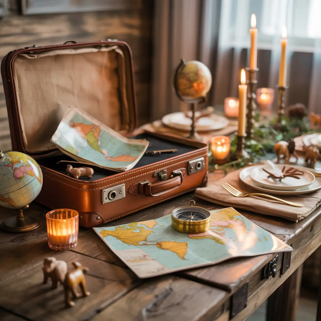 Use vintage travel accessories as functional decor. Old suitcases become serving tables or storage, vintage cameras create interesting displays, and travel posters from different eras add authentic wanderlust vibes.
