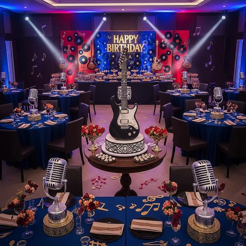 Choose his musical era or genre as your foundation. A vinyl-era setup with record players, vintage album covers, and retro furniture creates incredible ambiance. Modern electronic music themes work with LED lighting, sleek surfaces, and futuristic elements.