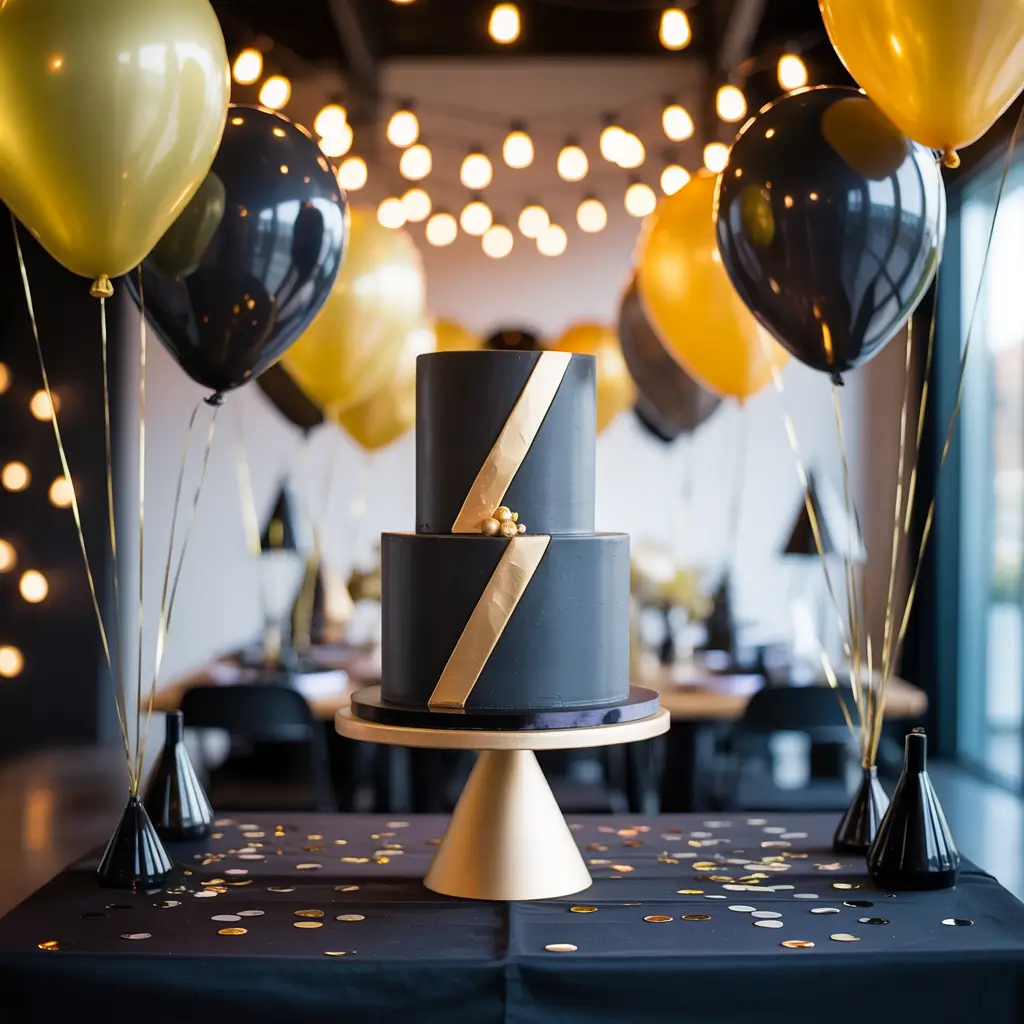 Sometimes you want sophisticated celebration vibes without committing to a specific theme. Black and gold delivers instant class while remaining masculine and celebratory. It’s the little black dress of party themes – always appropriate, always impressive.