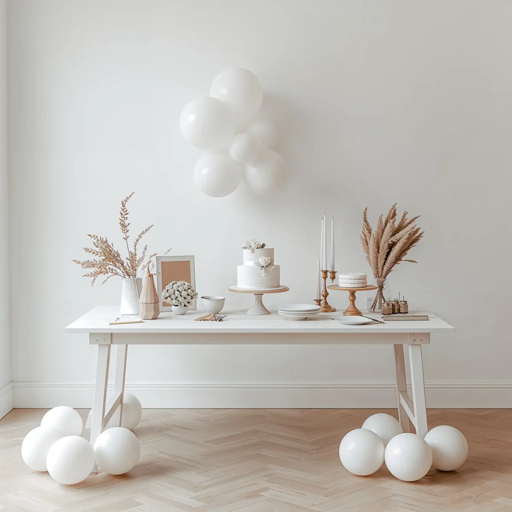 Sometimes less really is more, and minimalist party decor can be absolutely stunning when done right. This approach is perfect for adults who appreciate clean lines and sophisticated aesthetics – or for anyone who’s tired of cleaning up glitter for weeks after a party.