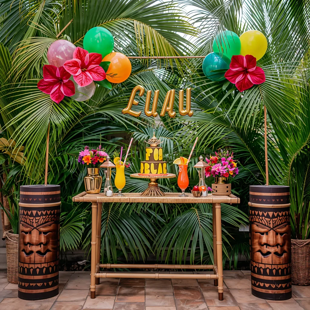Tiki torches (or LED versions for safety) create authentic ambiance and provide beautiful lighting as the evening progresses. Bamboo elements like placemats, serving trays, or decorative screens add to the tropical feel.