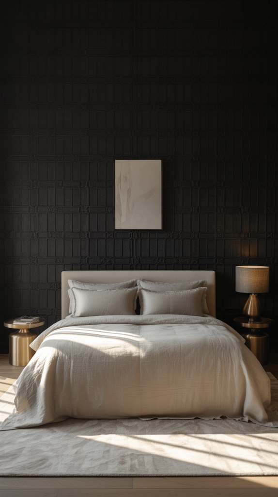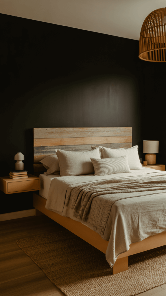 - How to Nail It: This is all about balance. The rich, dark wall gets balanced by lighter, natural wood elements. Think a beautiful reclaimed wood headboard, floating nightstands, or even hardwood floors with a warm finish. The grain and texture of the wood break up the solid black beautifully.
